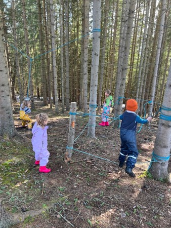 I skogholtet like ved gapahuken har foreldrene tilrettelagt et område med ulike tauaktiviteter hvor barna både får utfolde og utfordre seg motorisk.